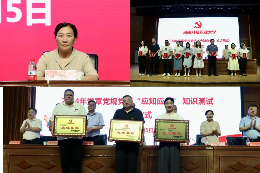会上,校党委委员、工会主席崔海花同志宣读了第三届党章党规党纪“应知应会”知识竞赛表彰决定,并为获得先进集体和先进个人颁发了奖牌奖品和荣誉证书。